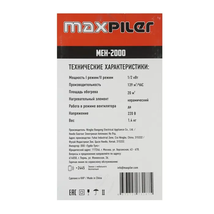 Тепловая пушка MAXPILER MEH-2000, электрическая, 1000/2000 Вт, 139 м3/ч, до 20 м2 — Характеристики