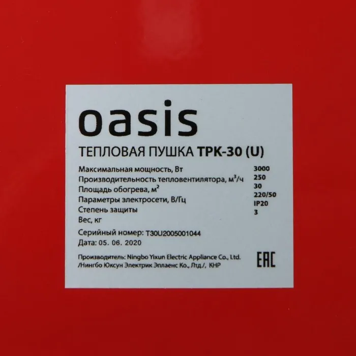 Тепловая пушка Oasis TPK-30, электр., 1/2/3 кВт, 250 м3/час, до 30 м2 + СВЕРЛА В ПОДАРОК — Характеристики