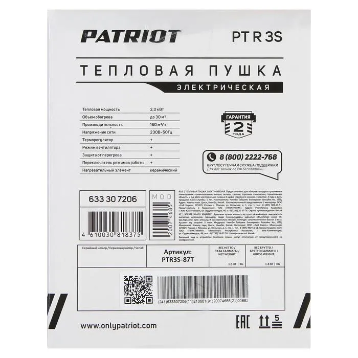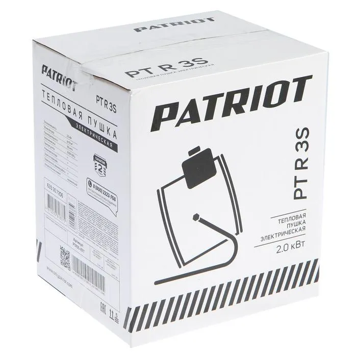 Тепловая пушка PATRIOT PTR=3S, электрическая, 220 В, 2000 Вт, терморегулятор, керамика — Характеристики