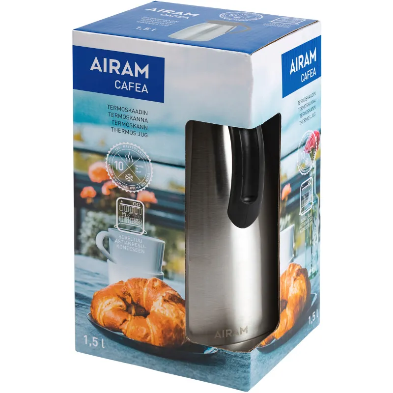 Термос Airam Cafea — это высококачественная стальная колба с вакуумной изоляцией, которая легко моется в посудомоечной машине. Его поверхность обработана титановым покрытием, предотвращающим прилипание загрязнений. Инновационная герметичная быстрая крышка предотвращает капли и обеспечивает легкость в использовании. В конструкции отсутствуют стеклянные элементы, что делает его более прочным. Гарантия на сохранение тепла составляет 10 лет.