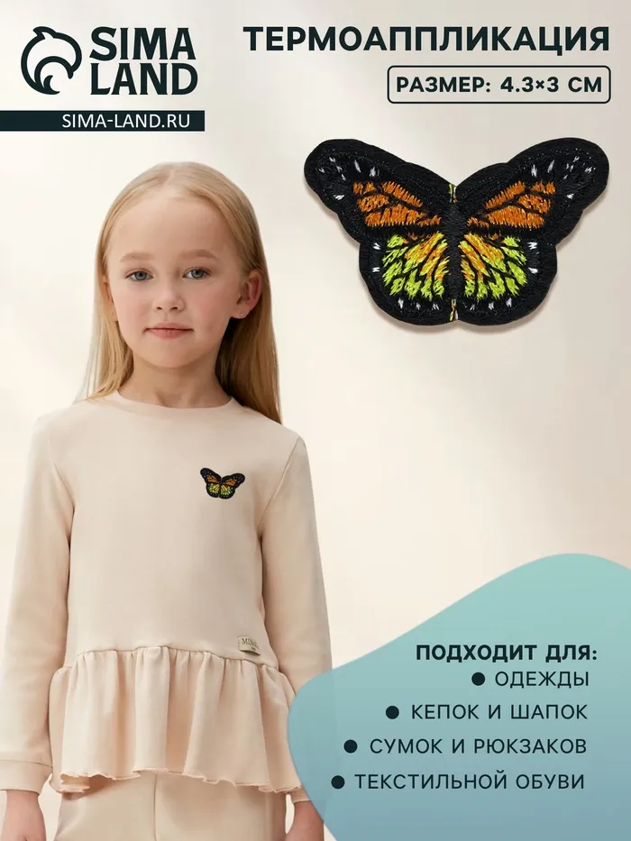 Термоаппликация «Бабочка» от торговой марки "Арт Узор" — это текстильная термонаклейка в виде яркой оранжевой бабочки. Размер аппликации составляет 4,3 × 3 см, что делает её идеальной для декорирования детской и взрослой одежды, аксессуаров или домашнего текстиля.