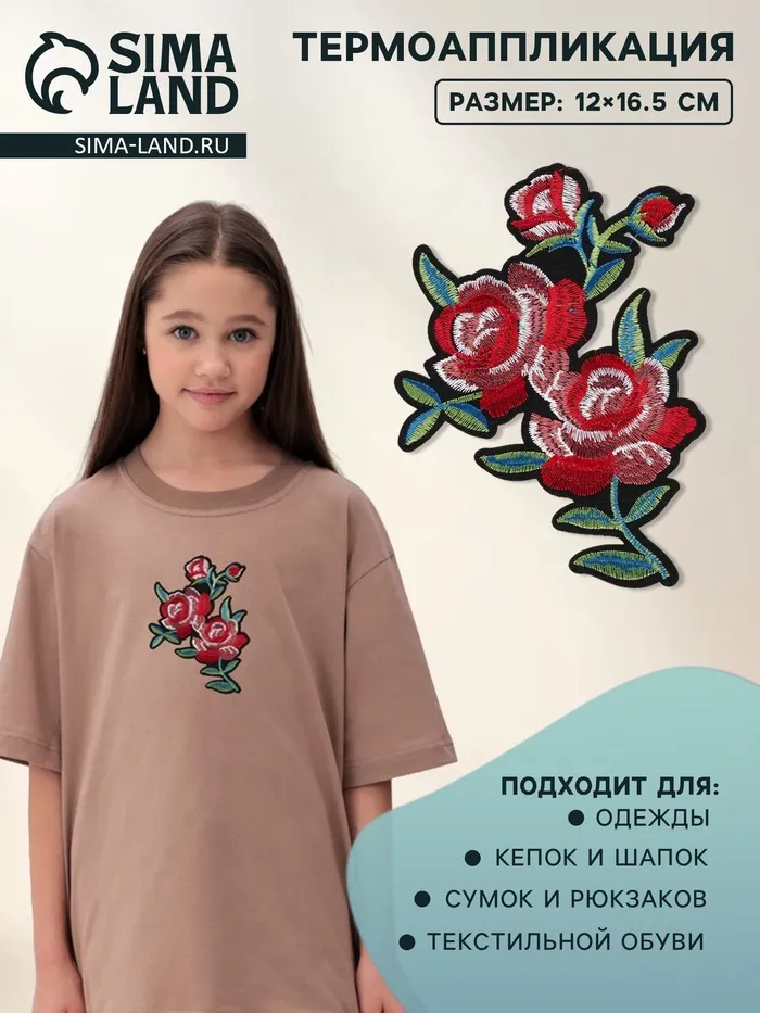 Яркий акцент для детской одежды и аксессуаров! Термоаппликация с розами (16,5×12 см) — это готовый декор для украшения текстиля. С помощью утюга вы легко перенесете красочный цветочный мотив на футболки, рюкзаки, сумки или домашний текстиль, обновляя вещи за несколько минут.