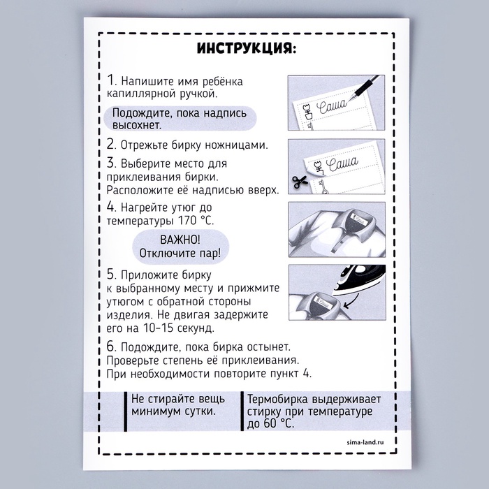 Напишите имя ребёнка капилярной ручкой ( подождите пока надпись высохнет).Отрежьте бирку ножницами и выберите место для приклеивания бирки. Расположите её надписью вверх.Нагрейте утюг до температуры 170 градусов (предварительно отключите пар).Приложите бирку к выбранному месту и прижмите утюгом с обратной стороны изделия. Не двигая задержите его на 10-15 секунд.Подождите, пока бирка остынет. Проверьте степень её приклеивания. При необходимости повторите.Важно