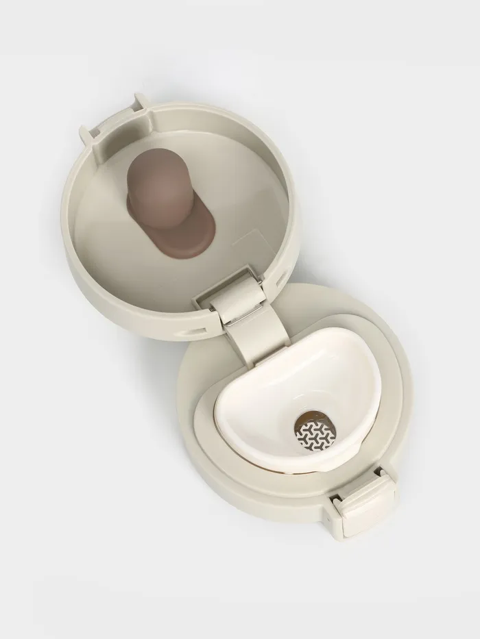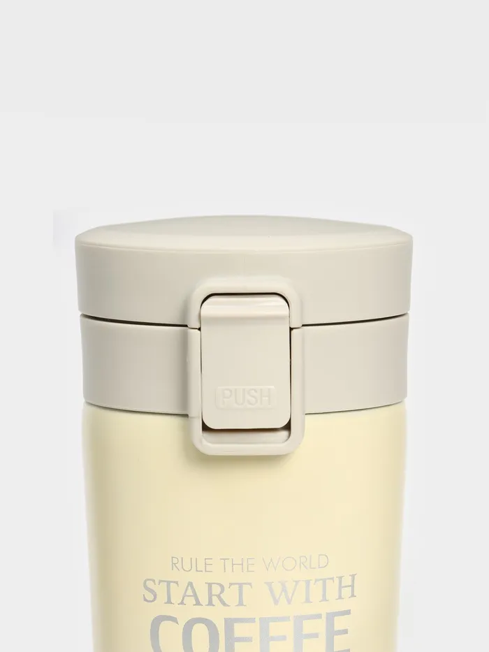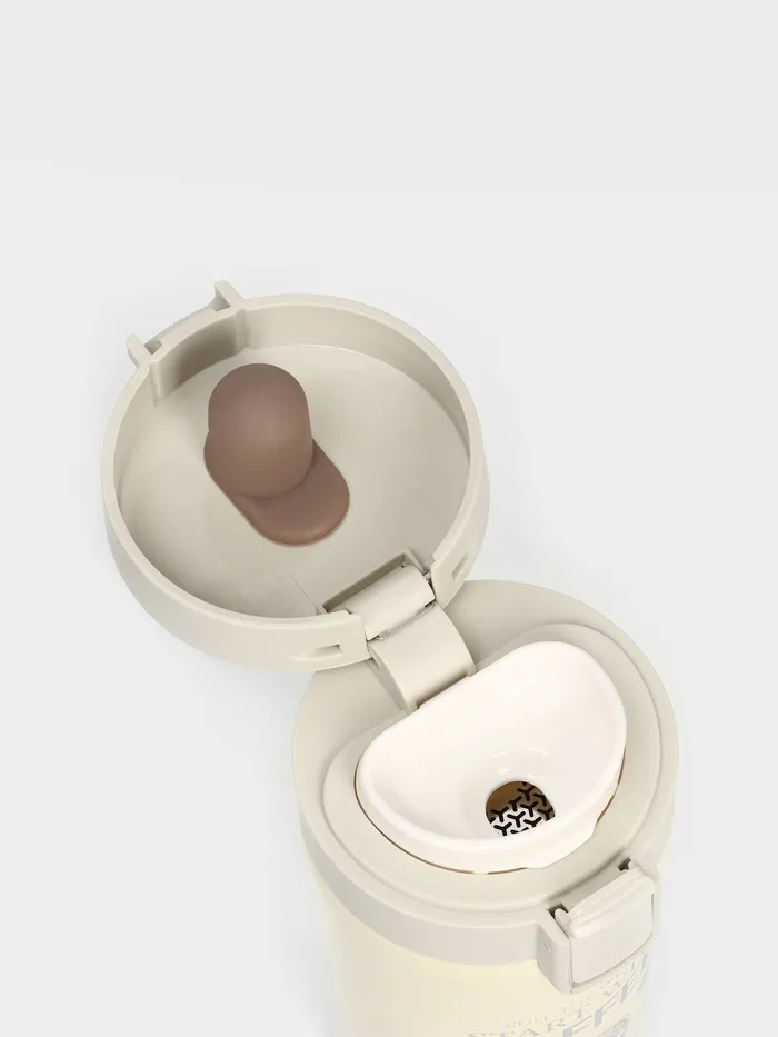 Термокружка сделана из нержавеющей стали марки 304, сконструирована по вакуумной технологии, с двойной стенкой, следовательно, долго держит тепло и не проливается. Снабжена откидывающейся крышкой, изготовленной из экологичного пищевого пластика, имеется кнопка с функцией блокировки, позволяющая с легкостью использовать термос одной рукой. На дне, термокружка имеет специальную прорезиненную основу, предотвращающую царапины на поверхностях.