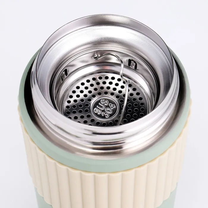 Термокружка"New design", с функцией сохранения тепла до 12 часов, оснащена встроенным термометром, ситом из нержавеющей стали, а также имеет корпус из прочного пластика и силикона. Такое идеальное сочетание стиля и функциональности, которое будет радовать вас каждый день.
