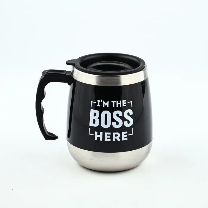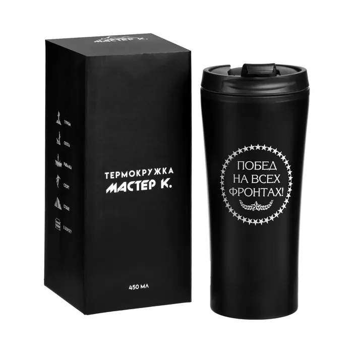 Термокружка для кофе и чая "Мастер К" идеальна для офиса, автомобиля, длительных прогулок и детям в школу. Благодаря специальному покрытию надежно лежит в руке.