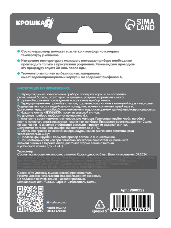 Термометр выполнен из безопасных материалов, не содержит стекла и ртути.