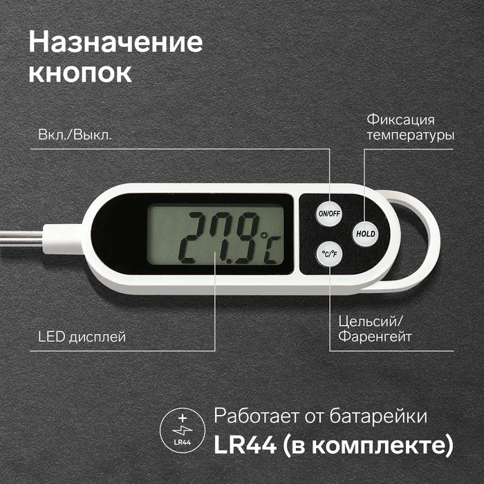 Термометр (термощуп) кухонный Luazon LTR-01, максимальная температура 300 °C, от LR44, белый — Характеристики