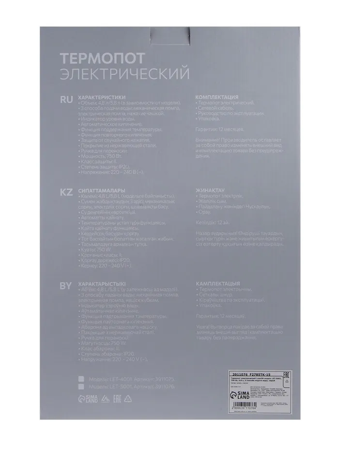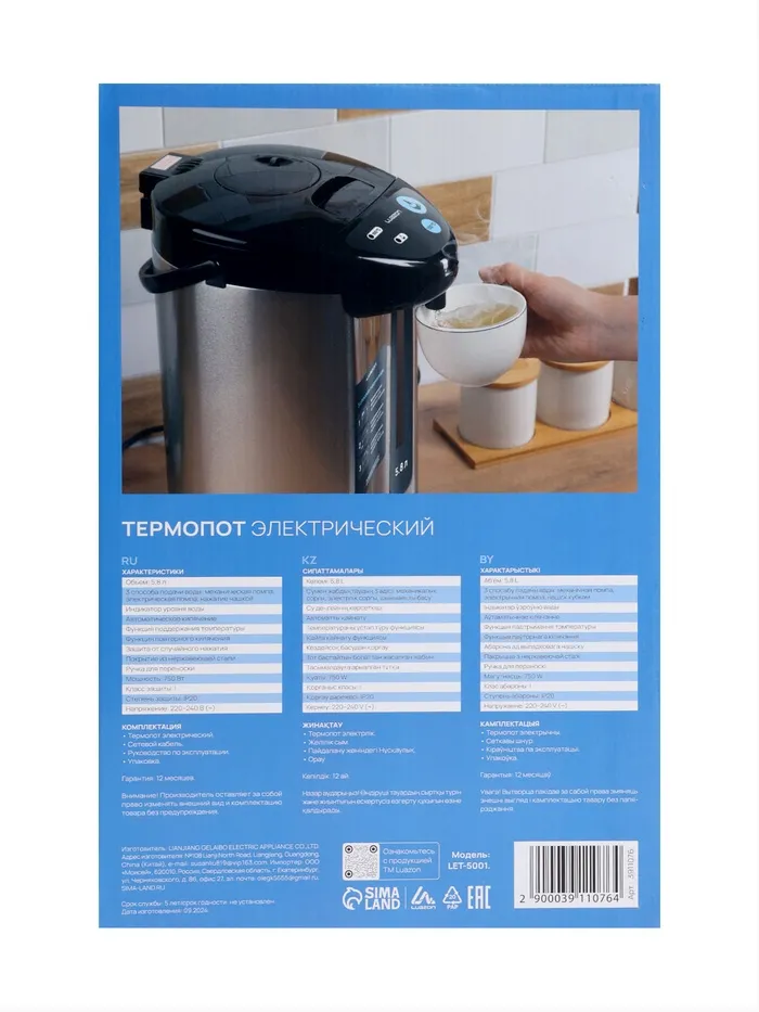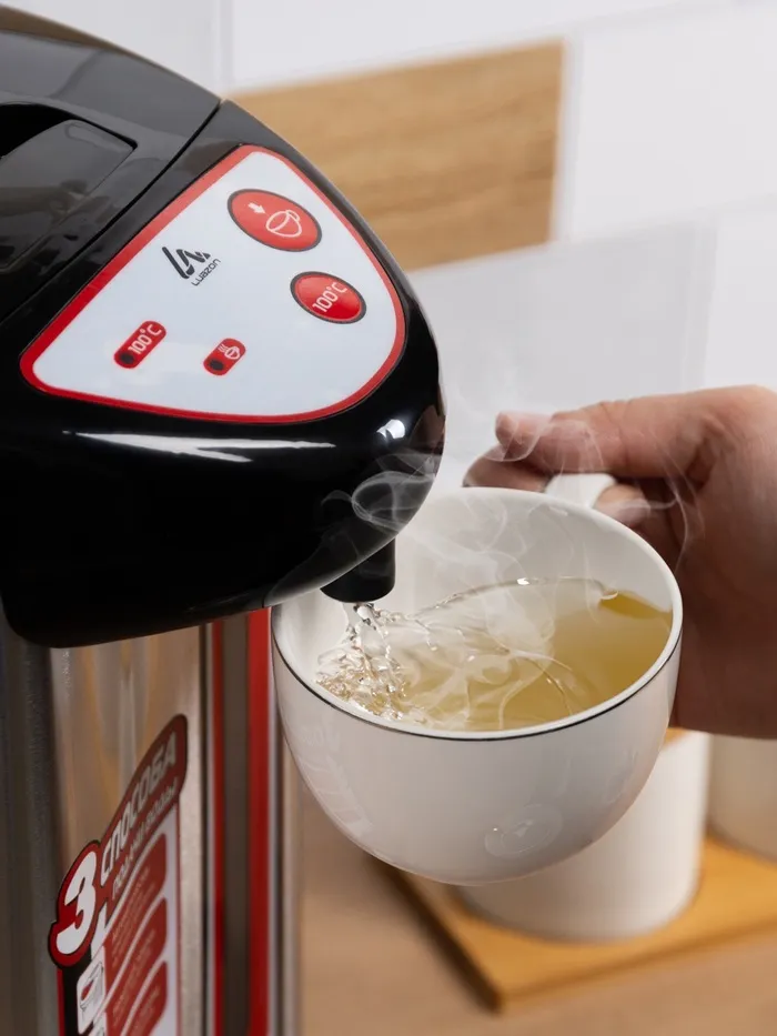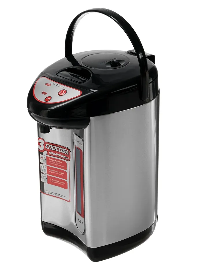 Обеспечьте себя постоянным источником горячей кипяченой воды с нашим термопотом Luazon LET-5001. Он представляет собой гибрид чайника и термоса: благодаря высокой мощности в 750 Вт устройство быстро кипятит воду, а после поддерживает температуру напитка 50 °С. Термопот вмещает 5,8 л воды, такого количества хватит на целый день для семьи из 4-х человек.
