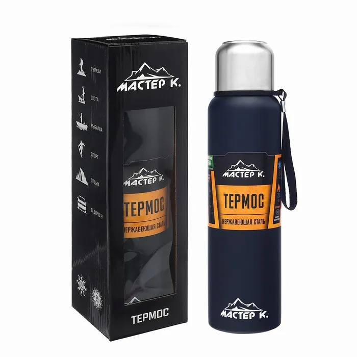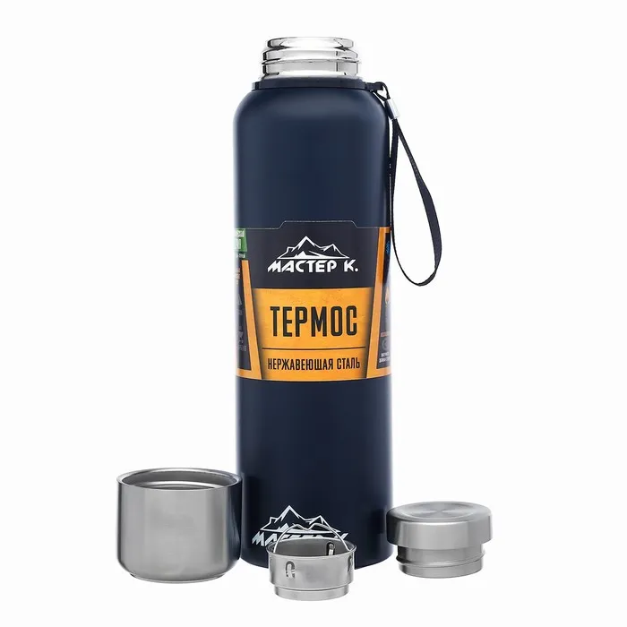 Термос, 1.5 л, Путешествие "Мастер К.", сохраняет тепло 24 ч, кружка, ситечко, темно-синий — Характеристики