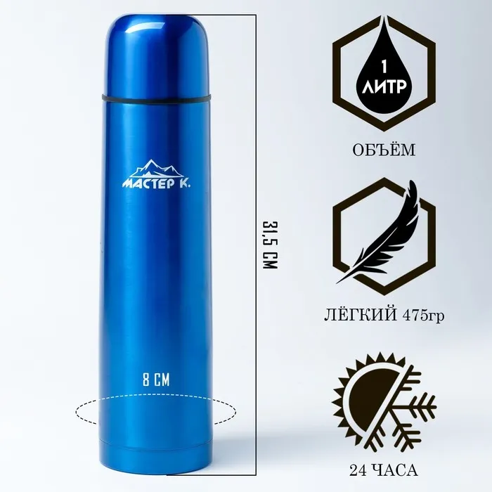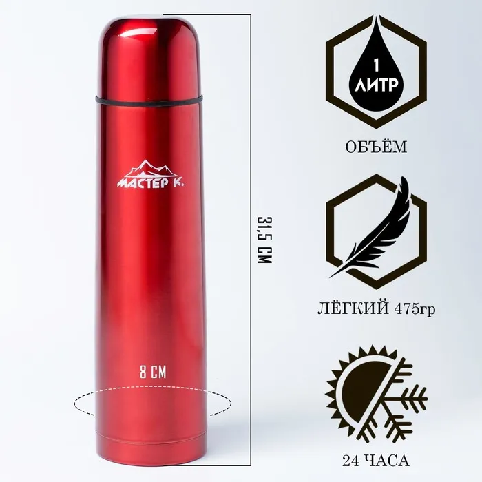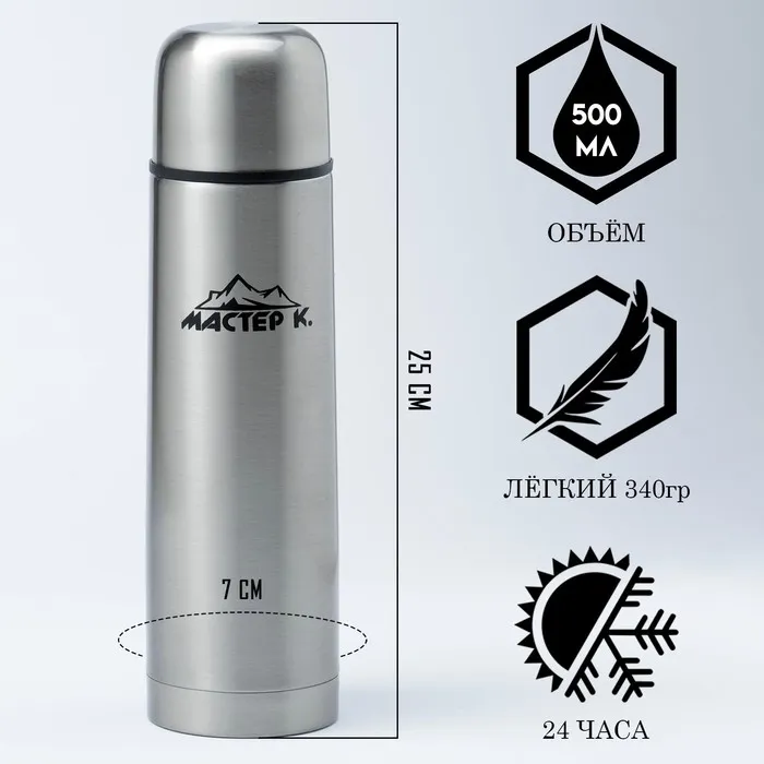 Термос 750 мл "Мастер К" изготовлен из высококачественной нержавеющей стали, имеет двойные стенки, обеспечивающих вакуумную термоизоляцию. Легкий и прочный термос "Мастер К" сохранит ваши напитки горячими или холодными надолго. Это идеальный выбор для тех, кто хочет наслаждаться горячими напитками во время отдыха на природе или в поездках, напиток останется теплым и свежим, готовым к наслаждению в любой момент. Термосы этой серии пользуются большой популярностью у активных и динамичных пользователей, а также у любителей охоты и рыбалки, так как они, сохраняют прочность и термоустойчивость, легки и компактны.