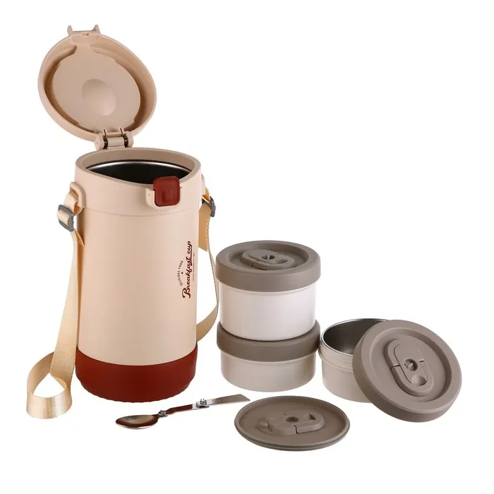 Термос для еды, 1.2 л, 27×15 см, 3 контейнера, складная ложка, нержавеющая сталь, бежевый, красный — Характеристики