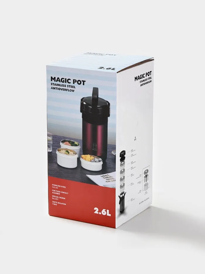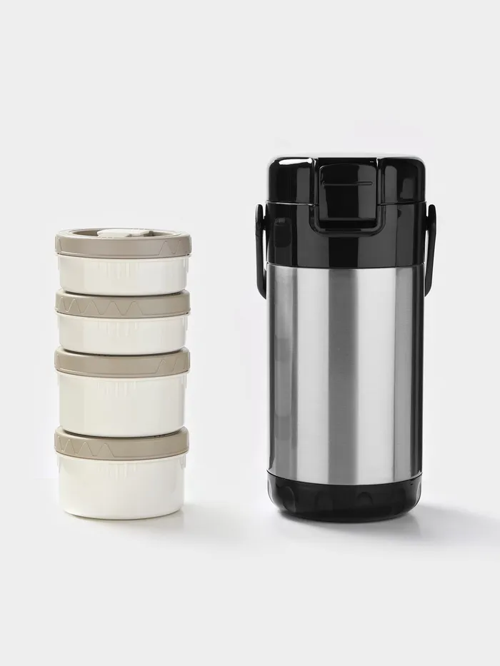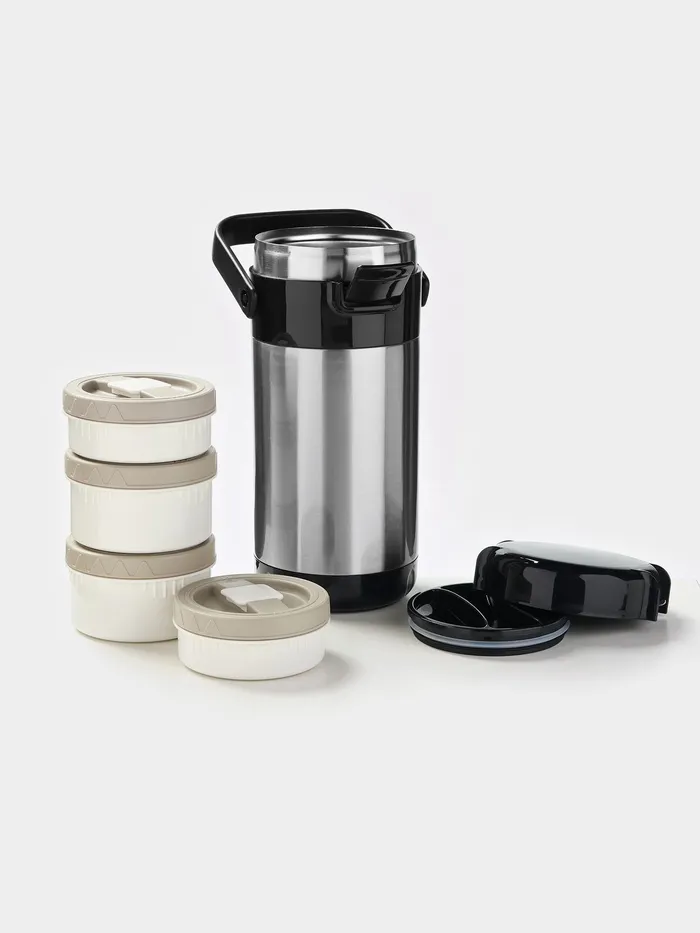 Термос для еды оснащен четырьмя контейнерами, что позволяет разделять продукты и сохранять их свежими. Герметичная крышка обеспечивает надежную защиту от протечек, так что его можно спокойно носить в сумке. Этот термос станет отличным подарком для тех, кто ценит качественные и удобные вещи.