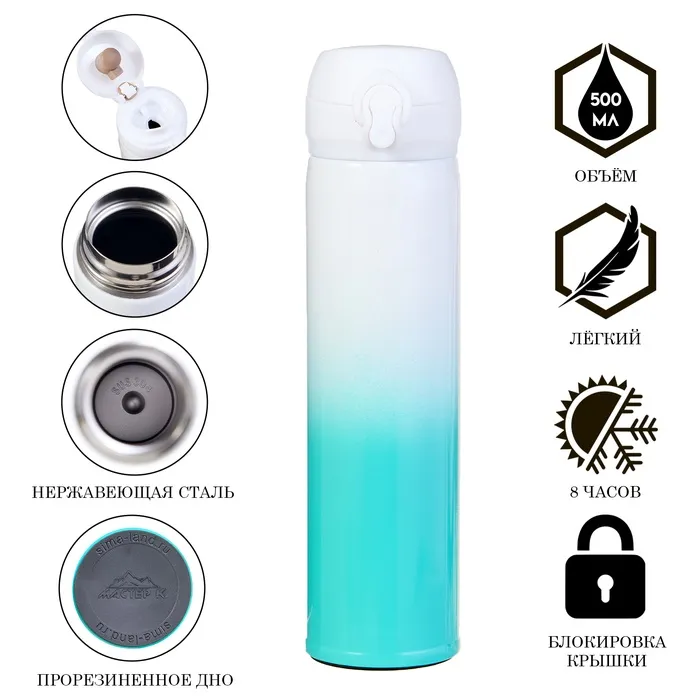 Компактный, экологичный, стильный. Термосы этой серии пользуются большой популярностью у активных и динамичных пользователей, а так же у любителей охоты и рыбалки, так как они, сохраняют прочность и термоустойчивость, легки и компактны. Этот термос просто идеально подойдет для тех, кто ценит свое время и хочет наслаждаться свежим и горячим кофе, чаем или другими любимыми напитками в любой ситуации. Термос "Мастер К" 500 мл (0.5 л) это яркое решение для любителей чая, кофе, травяных, ягодных и фруктовых заварок. Летом данный термос станет приятным спутником на пляж и в жаркий день, так как он сохраняет напиток холодным.