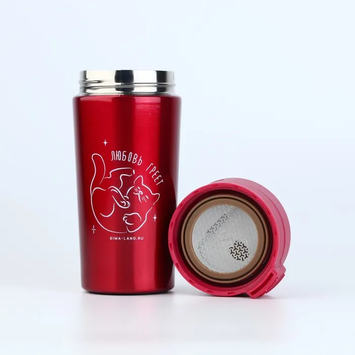 - Оригинальный дизайн. Термостакан украшен ярким рисунком с котиком. Такой подарок точно не останется незамеченным.