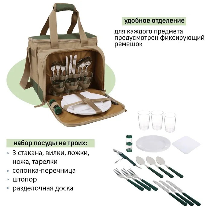 Незаменимый набор для организации пикника — сумка-холодильник и комплект стильной многоразовой посуды. Изотермическое отделение покрыто внутри теплоизоляционным фольгированным слоем, который позволяет сохранить свежесть и прохладу напитков и еды до 75 часов. В отделении с посудой хранится комплект на 3 персоны: 3 стакана, 3 вилки, 3 ложки, 3 ножа, 3 тарелки, солонка-перечница, штопор и разделочная доска. Можно использовать как с набором посуды, так и без него. Есть наружный карман для хранения мелочей. Объем холодильного отсека — 13.5 л.