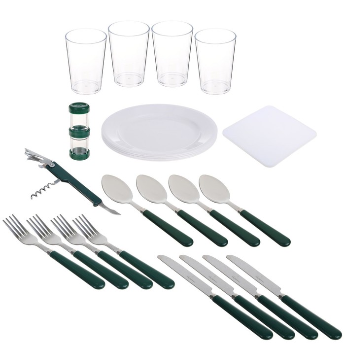 - В отделении с посудой хранится комплект на 4 персоны: 4 стакана, 4 вилки, 4 ложки, 4 ножа, 4 тарелки, солонка-перечница, штопор и разделочная доска. Можно использовать как с набором посуды, так и без него.