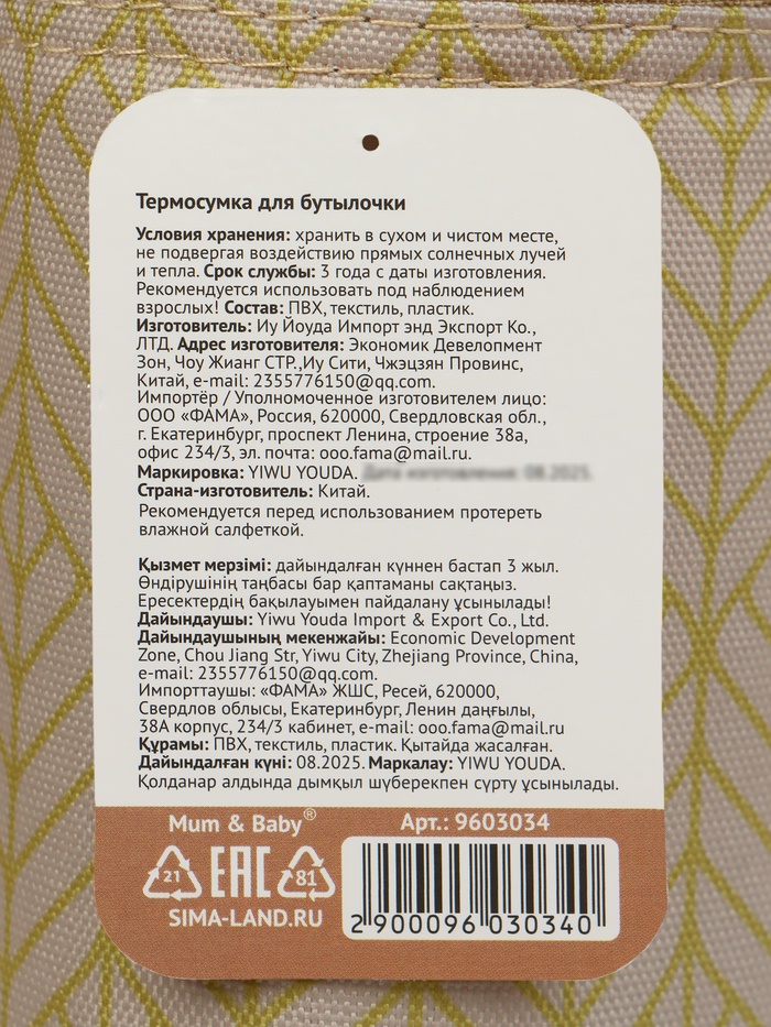 Термосумка для бутылочки «Sand», форма тубус — Характеристики