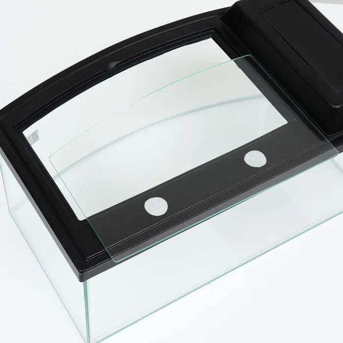 Комплект террариумов выполнен из высококачественного стекла, благодаря евро кромке имеет высокую защиту от трещин, сколов, что повышает степень безопасности при эксплуатации. Крышка надежно защищает от пыли, оснащена патроном под лампу Е14, светодиодной лампой Е14 на 7 ватт и защитным плафоном. Компактные размеры террариума позволяют разместить его в любом удобном месте, что делает его более доступным и удобным для использования и ухода, а панорамное смотровое стекло увеличивает угол обзора – можно наблюдать за жизнью питомца с любого угла. Любимец будет обеспечен кусочком суши и комфортными условиями для существования. Указан номинальный объём террариума.