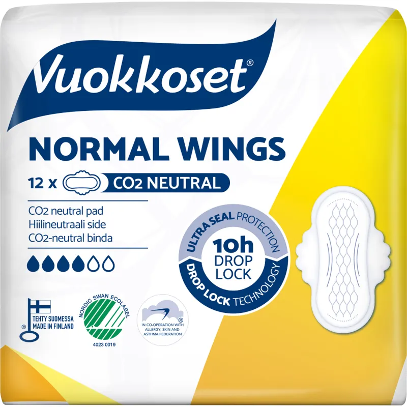 Vuokkoset Normal Wings - это мягкие тонкие прокладки, которые подходят для любого дня менструального цикла. Крылышки обеспечивают надежную фиксацию и комфортное ношение. Прокладки обладают высокой впитывающей способностью для нормальных и обильных выделений. Продукт отмечен знаком Финской ассоциации аллергии и астмы и экосертификатом. Упаковка содержит 12 штук.