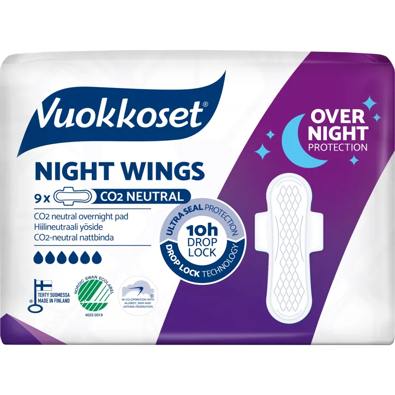 Гигиенические прокладки Vuokkoset Night Wings с крылышками созданы специально для ночного использования. Они имеют мягкую поверхность и повышенную впитываемость, разработаны в сотрудничестве с Ассоциацией аллергии и астмы и имеют экологический знак. Прокладки упакованы индивидуально. Упаковка содержит 9 штук.