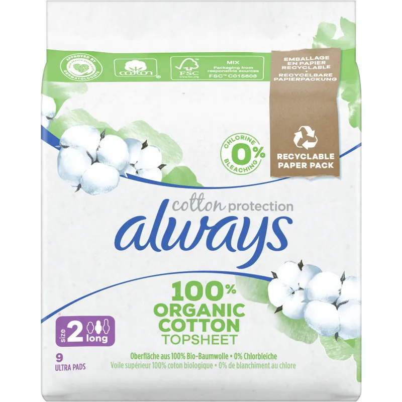 Гигиенические прокладки Always Cotton Protection Ultra Long с крылышками и удлиненной формой обеспечивают надежную защиту и заботу о вас и окружающей среде. Изготовлены из 100% органического хлопка и упакованы в перерабатываемую бумажную упаковку. Не содержат ароматизаторов и красителей, не отбелены хлором. Благодаря жидкости, запирающей гель в сердцевине, вы всегда будете чувствовать себя уверенно.