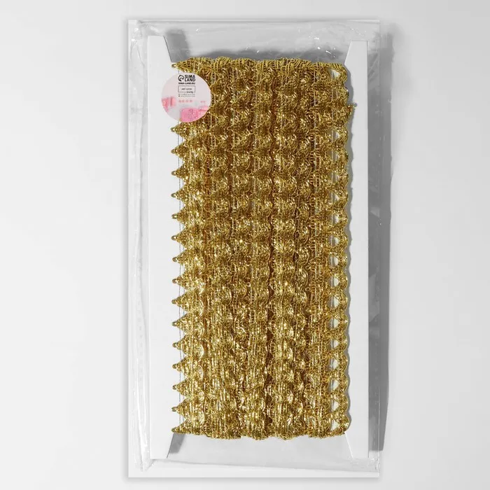Золотистая тесьма для декоративной отделки и творческих проектов. Десять метров узкой ленты шириной тринадцать миллиметров подходят для оформления текстиля, поделок или упаковки. Металлизированный оттенок создаёт эффект драгоценной нити, не утяжеляя конструкцию.