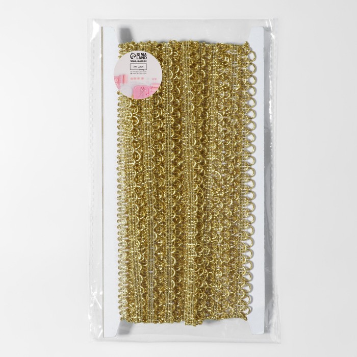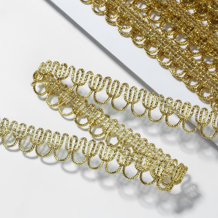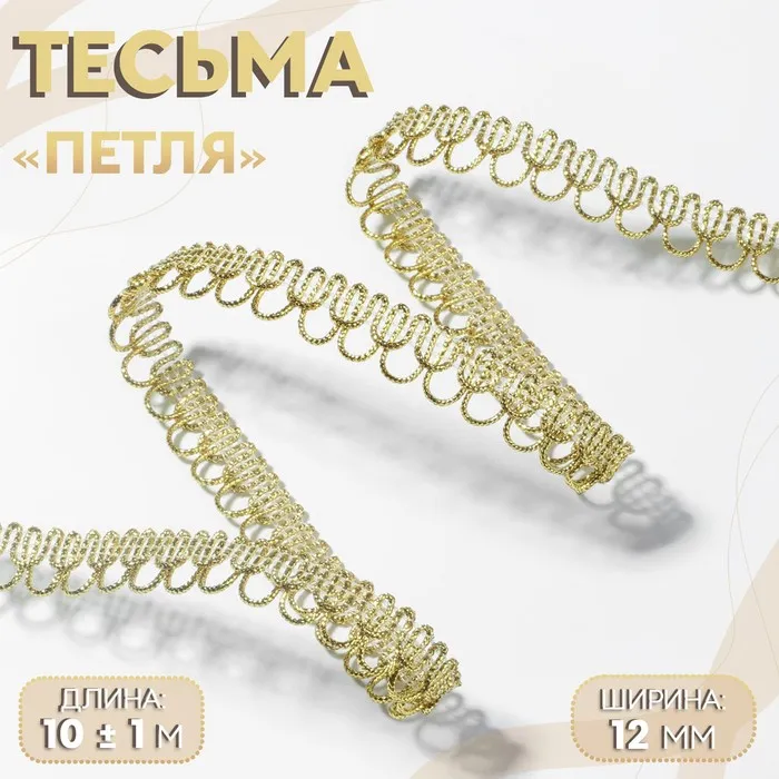 Золотистая декоративная тесьма «Петля» 12 мм — лаконичное решение для отделки и акцента в рукоделии, шитье и оформлении. Её узор с повторяющимися дугами придаёт лёгкость и ритм, а металлический оттенок добавляет изделию благородный блеск. Длина около 10 метров позволяет использовать тесьму в разных масштабах — от детской игрушки до интерьерного текстиля.