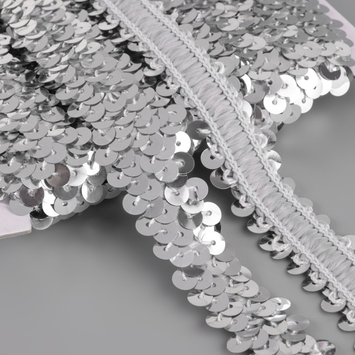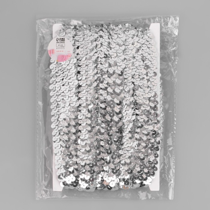 Тесьма декоративная с пайетками, на резинке, 2 см, 9 ± 0,5 м, цвет серебряный