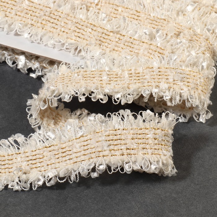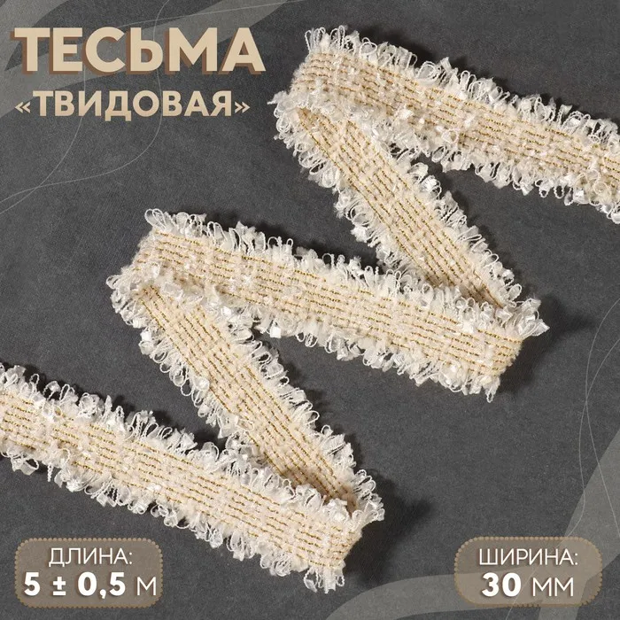Бежевая твидовая тесьма с двусторонним рисунком — универсальная отделка для создания аккуратного кантового шва или декоративного акцента. Её нейтральный оттенок и текстура под лён сочетаются с хлопком, шерстью и смесовыми тканями. Узкая 30-миллиметровая ширина подходит для тонкой окантовки.
