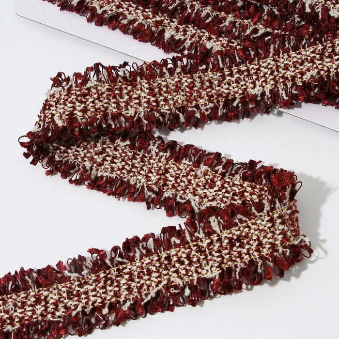 Бордовая твидовая тесьма от «Арт Узор» — элегантное решение для благородной отделки. Её насыщенный винный оттенок и двусторонняя фактура создают эффект дорогой шерстяной ткани. Широкая 30-миллиметровая полоса делает декор особенно выразительным.