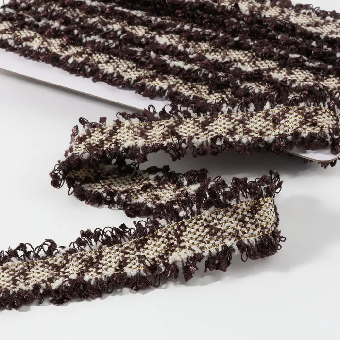 Коричневая твидовая тесьма — классическая отделка для создания стильных акцентов. Её натуральный оттенок и двусторонняя фактура напоминают текстуру шерстяной ткани. Широкая 30-миллиметровая полоса подчеркивает декоративный эффект.