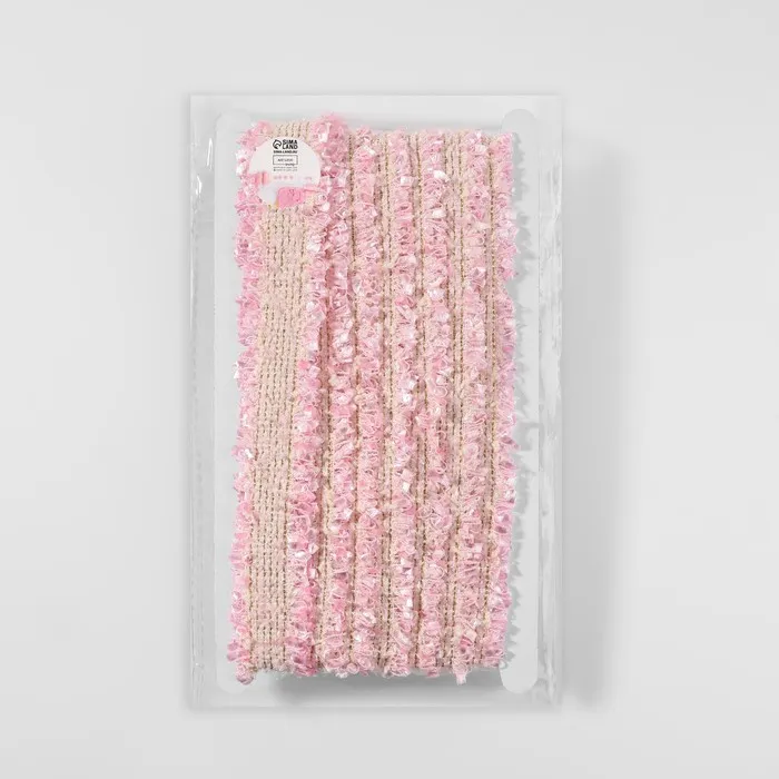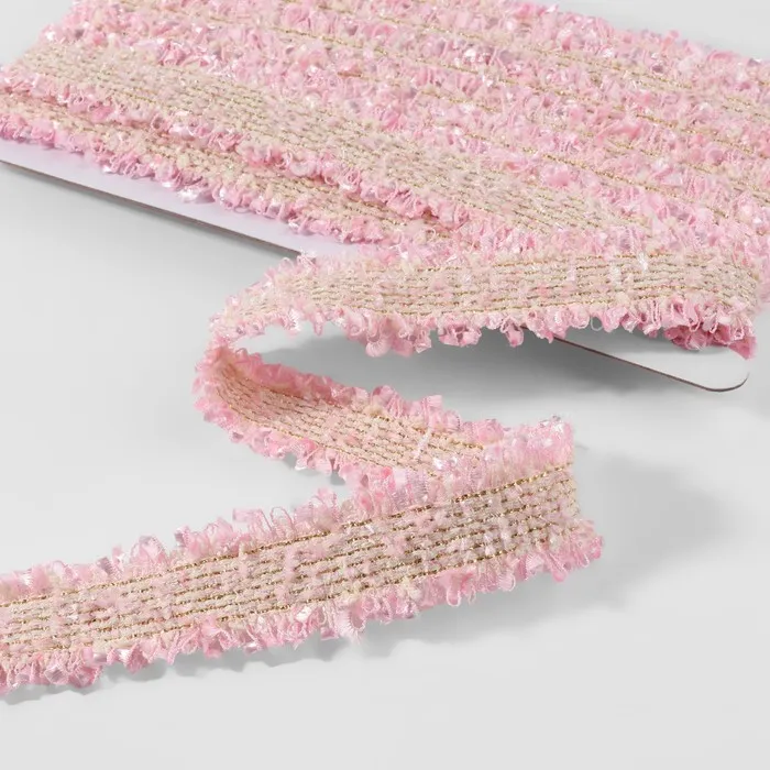 Розовая твидовая тесьма с двусторонним рисунком — стильное решение для декора одежды и текстиля. Её нежный оттенок и фактурное плетение создают эффект шерстяной ткани. Широкая 30-миллиметровая полоса подходит для выразительной отделки.