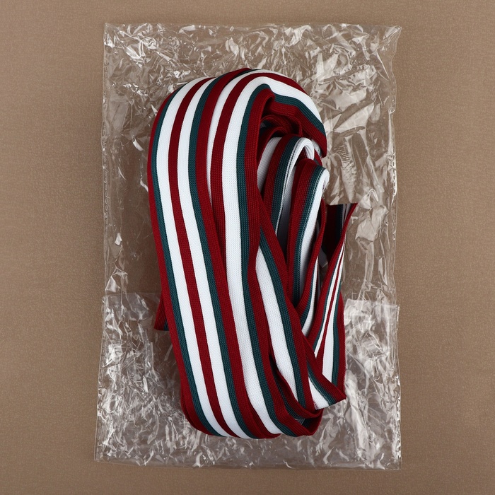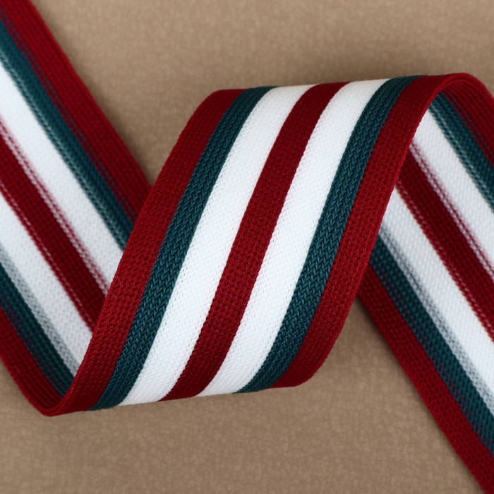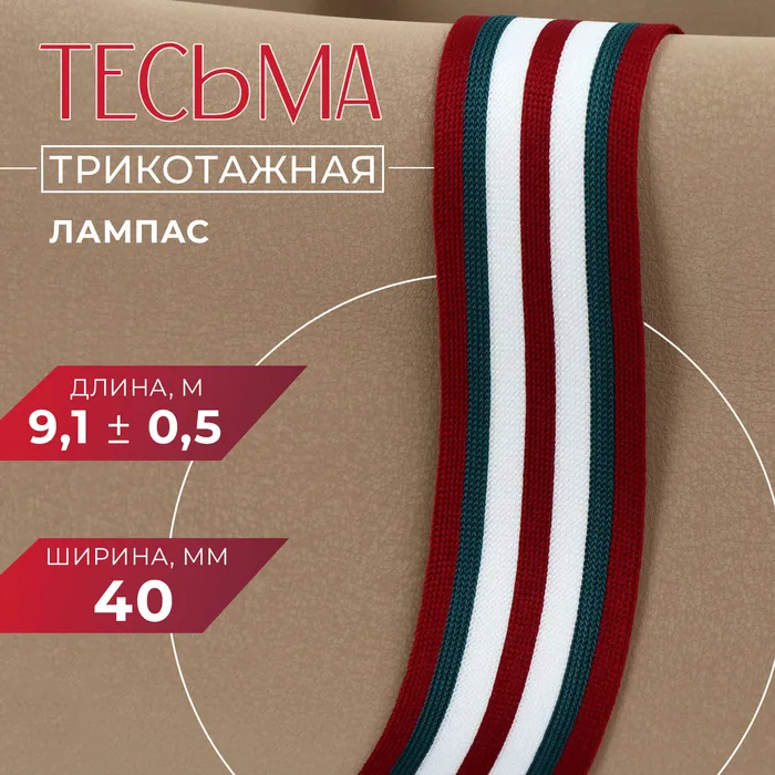 Тесьма трикотажная лампас 40 мм, 9,1 ± 0,5 м, цвет бордовый/зелёный/белый — Характеристики