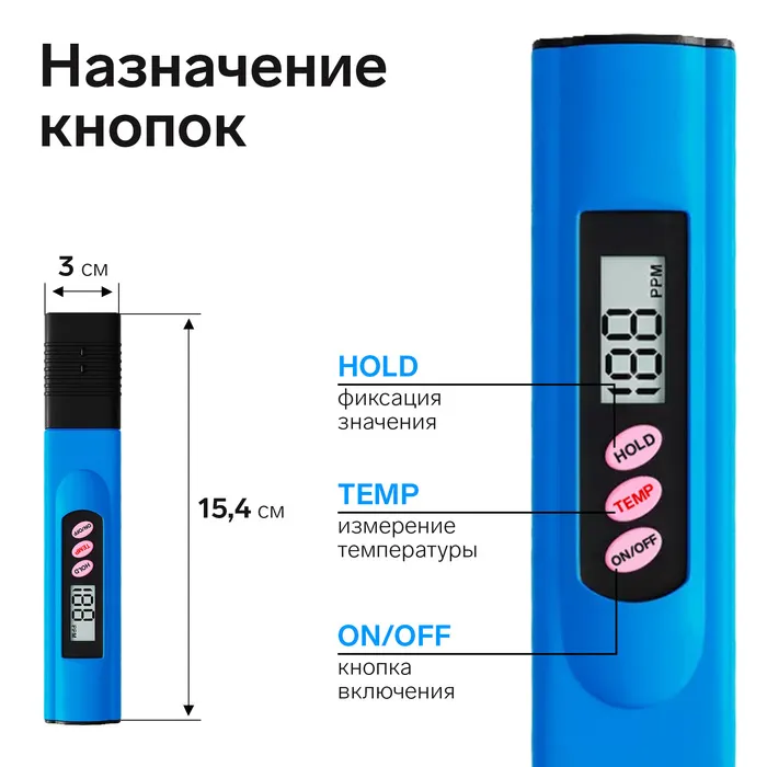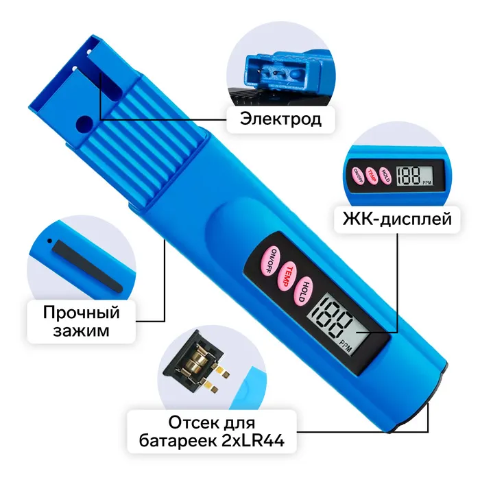 Тестер для воды LWT-01, солевой, цифровой, от 2хLR44 (в компл), голубой — Характеристики