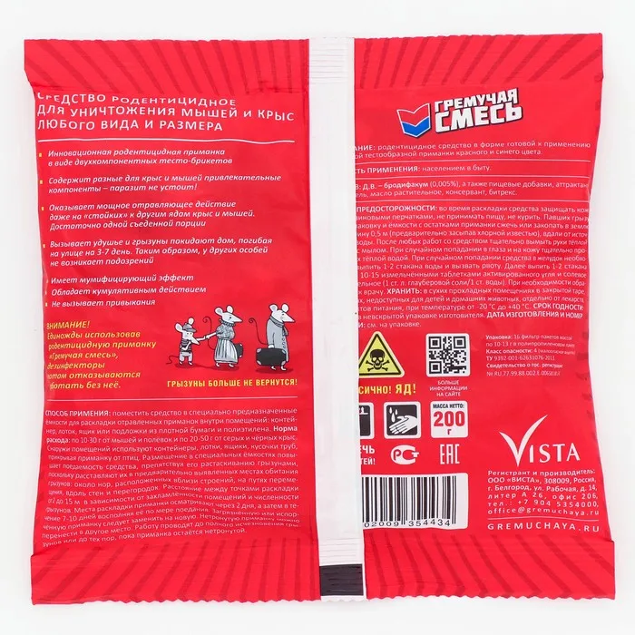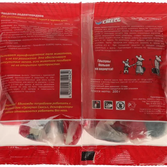 Гремучая смесь – это приманка для мышей, крыс и других грызунов. Которая позволяет эффективно справиться с грызунами как в домашних условиях, так и в подсобных, складских помещениях и общественных зданиях. Основное действующее вещество - бродифакум (0,005%) – это антикоагулянт, который нарушает свертываемость крови. Грызуны съедают летальную дозу уже после первого подхода к корму, и затем любое внешнее или внутреннее повреждение приводит к гибели. Раскладывайте приманку, не вынимая из бумажных фильтр-пакетов. Они пропускают запах, привлекая вредителей, но при этом не поддаются действию влажности и других разрушающих факторов, поэтому их можно использовать как в помещении, так и снаружи здания. Перед работой наденьте защитные перчатки и не допускайте попадания токсинов на кожу и в глаза. Если в доме есть дети и домашние животные, устанавливайте приманку в недоступных для них местах, например, внутри приманочных домиков.