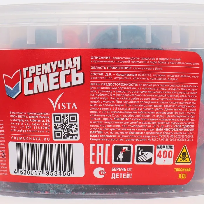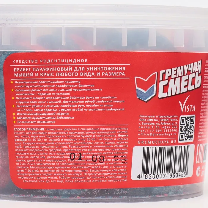 Тесто-брикеты от грызунов "Гремучая смесь", парафиновый брикет, 400 г — Характеристики