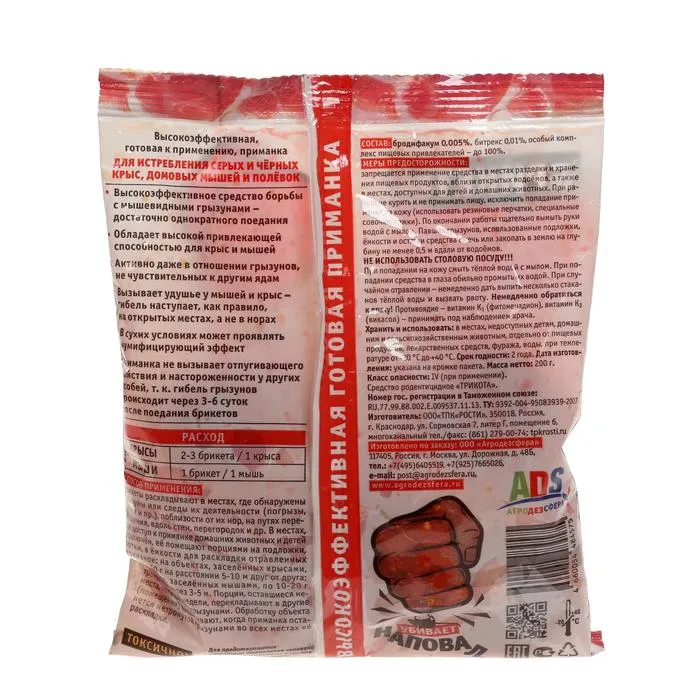 Высокоэффективная готовая к применению приманка для истребления серых и чёрных крыс, домовых мышей и полёвок.