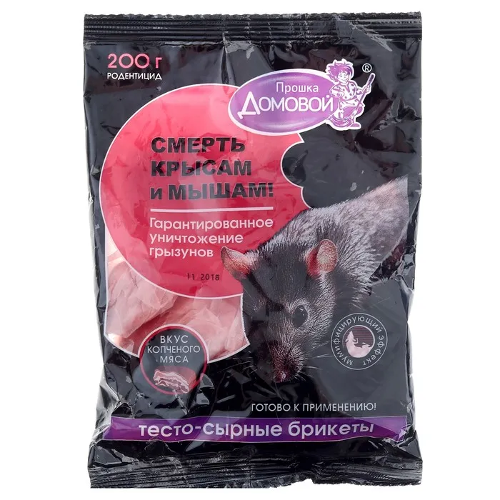Готовая к применению приманка в виде мягких брикетов красного или синего цвета для уничтожения крыс и мышей.