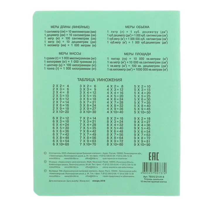 Тетрадь 12 листов крупная клетка «Зелёная обложка», с таблицей умножения, термоупаковка 25 шт. — Характеристики