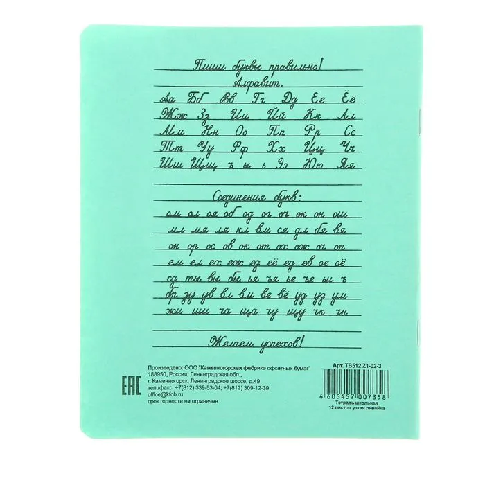 Тетрадь 12 листов узкая линейка «Зелёная обложка», с алфавитом, термоупаковка, фасовка по 25 шт. — Характеристики
