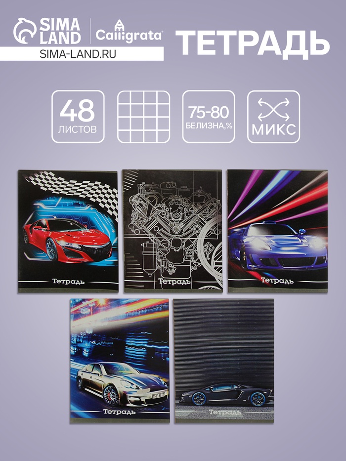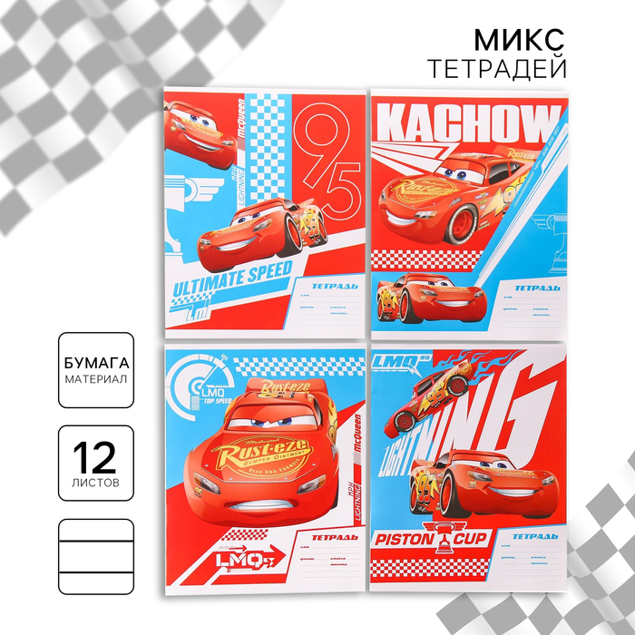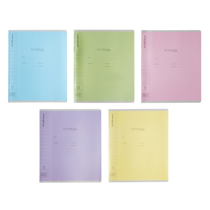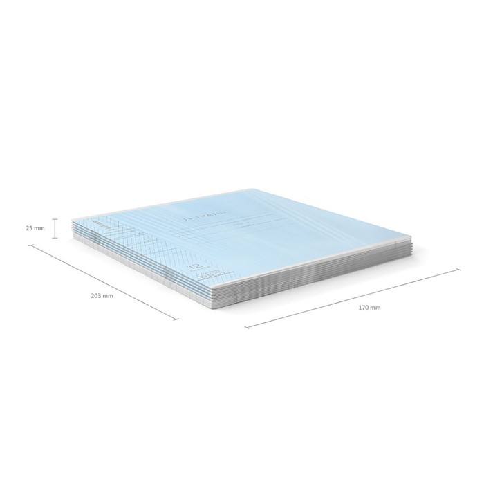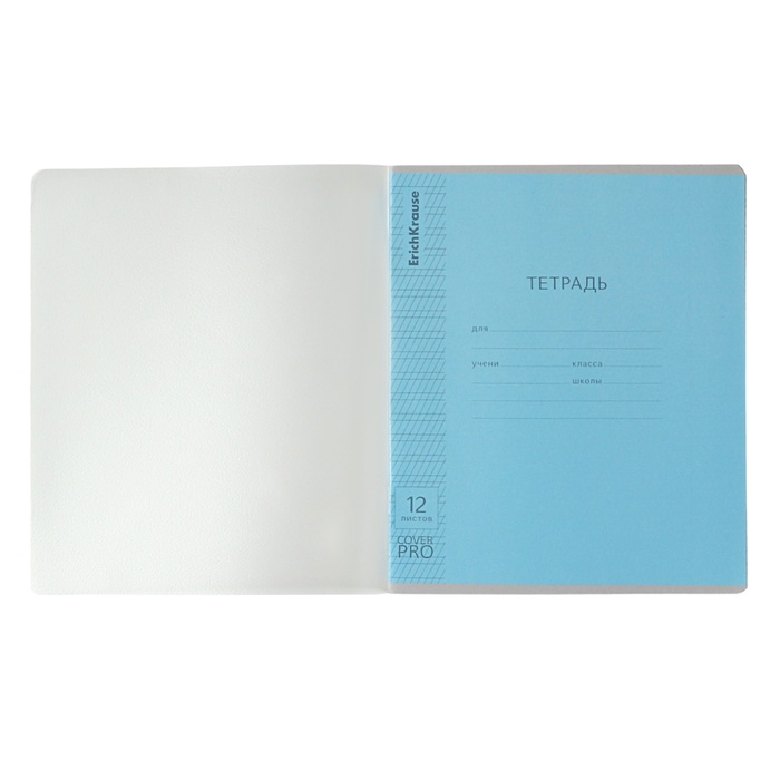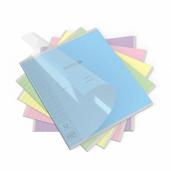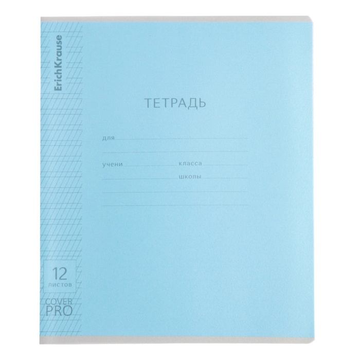 Тетрадь школьная ученическая формата А5+ (170x203 мм). Двойная обложка: внешняя выполнена из высококачественного износостойкого прозрачного пластика с фактурой «апельсиновая корка», внутренняя — из качественной мелованной бумаги. В блоке 12 листов в частую косую линейку. Бумага офсетная плотностью 60 г/м2. Цвет линовки — синий. Скругленные уголки обложки и блока. Тип скрепления — скоба. Тетради разных дизайнов упакованы в термоусадочную пленку по 10 штук.