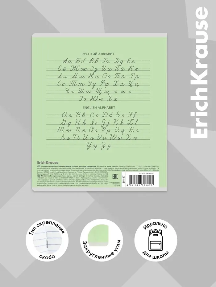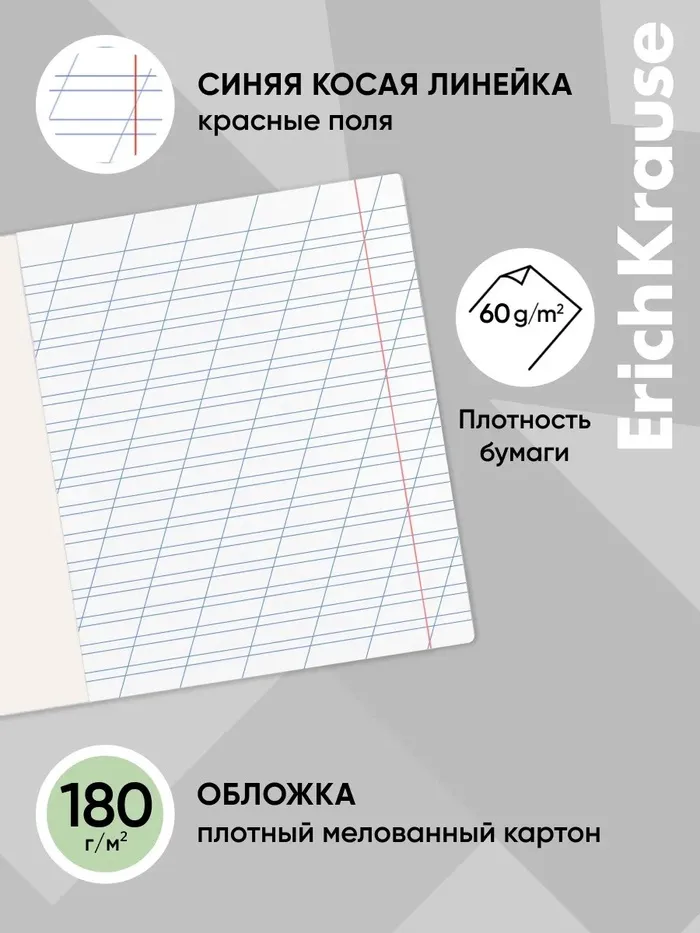 Тетрадь школьная ученическая формата А5+ (170 х 203 мм). Обложка из высококачественного мелованного картона плотностью 180 г/м2. В блоке 12 листов в частую косую линейку с полями. Бумага офсетная плотностью 60 г/м2. Цвет линовки - синий. Скругленные уголки обложки и блока. Тип скрепления - скоба. Тетради упакованы в термоусадочную пленку по 10 штук.