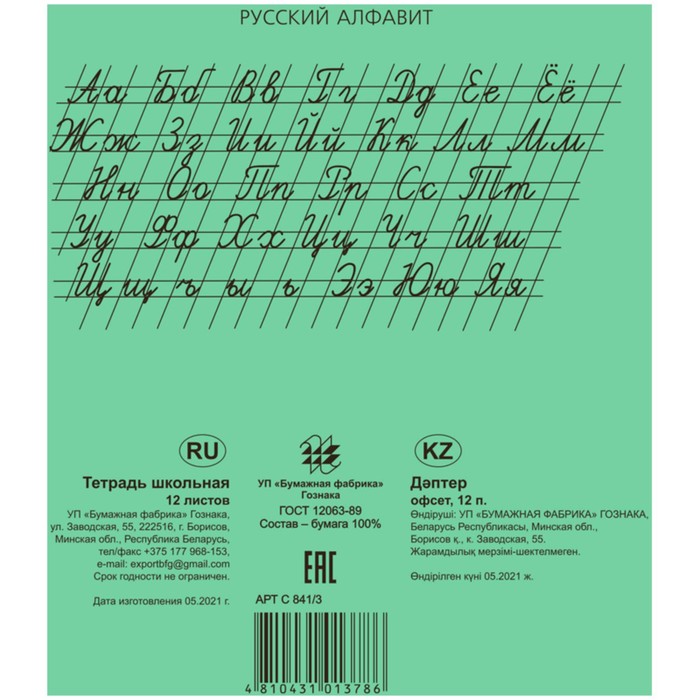Тетрадь 12 листов в частую косую линейку «зелёная обложка» бумажная фабрика, офсет №1, 60 г/м², белизна 96%