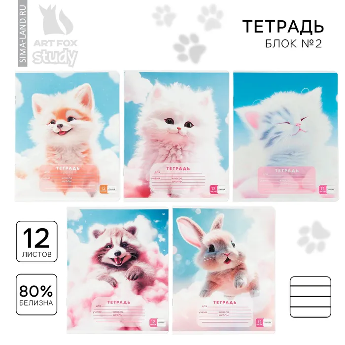 Тетрадь 12 листов в линейку, А5, на скрепке, блок №2 «Пушистики» МИКС — Характеристики