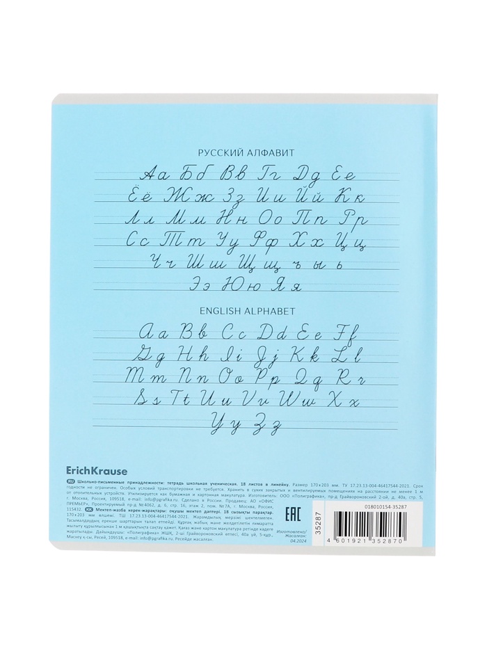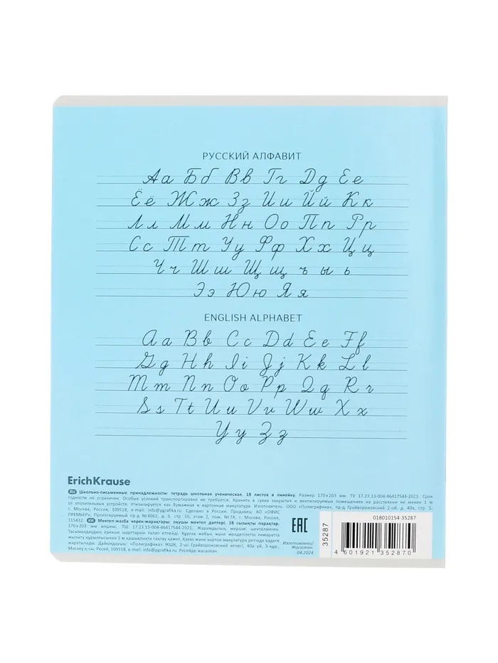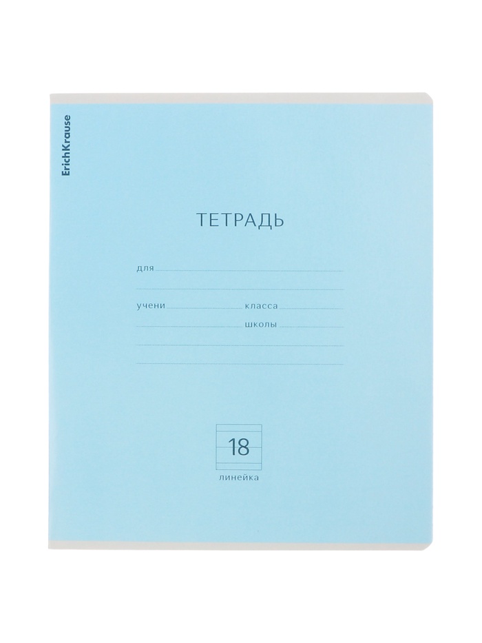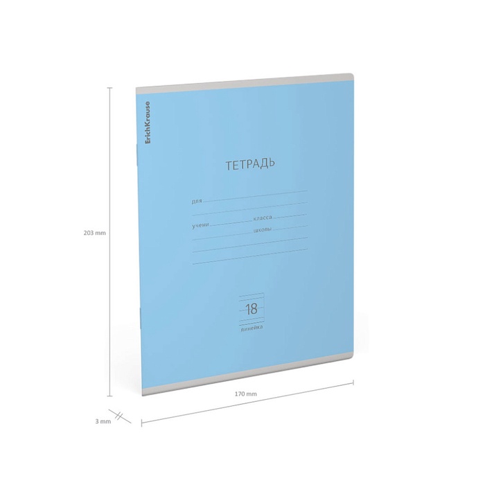 Тетрадь школьная ученическая формата А5+ (170 х 203 мм). Обложка из высококачественного мелованного картона плотностью 180 г/м2. В блоке 18 листов в линейку с полями. Бумага офсетная плотностью 60 г/м2. Цвет линовки - синий. Скругленные уголки обложки и блока. Тип скрепления - скоба. Тетради одного цвета упакованы в термоусадочную пленку по 10 штук. Товар поставляется в нескольких вариантах цвета без возможности выбора.