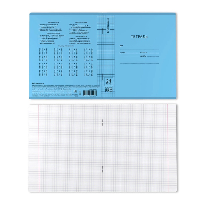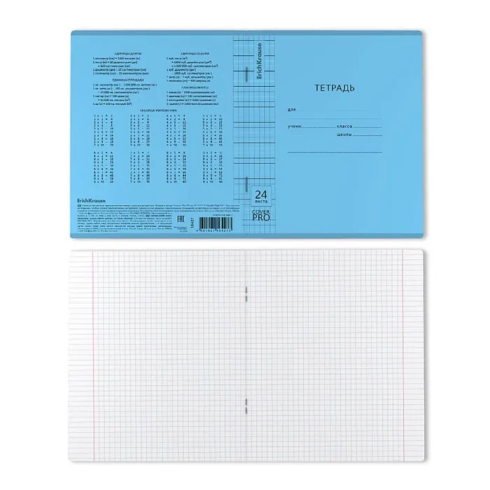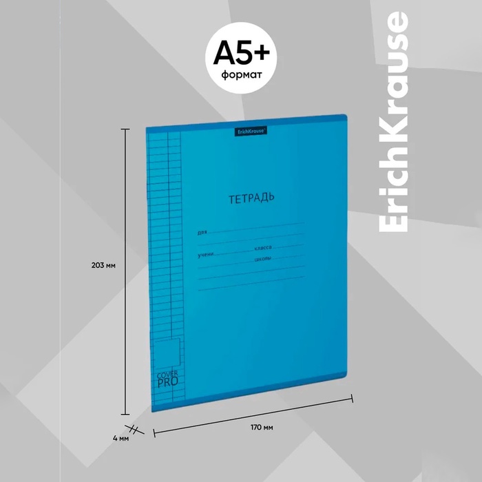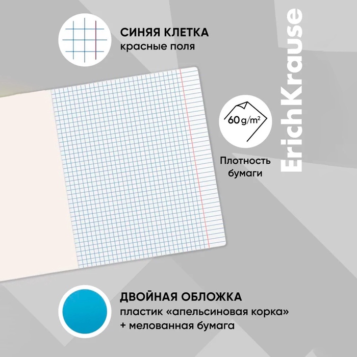 Тетрадь школьная ученическая формата А5+ (170x203 мм). Двойная обложка: внешняя выполнена из высококачественного износостойкого цветного пластика с фактурой «апельсиновая корка», внутренняя — из офсетной бумаги. В блоке 24 листа в клетку. Бумага офсетная плотностью 60 г/м2. Цвет линовки — синий. Скругленные уголки обложки и блока. Тип скрепления — скоба. Тетради упакованы в термоусадочную пленку по 10 штук.