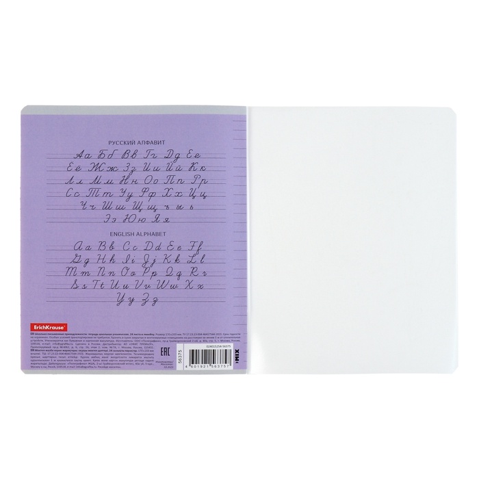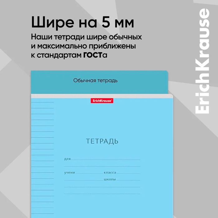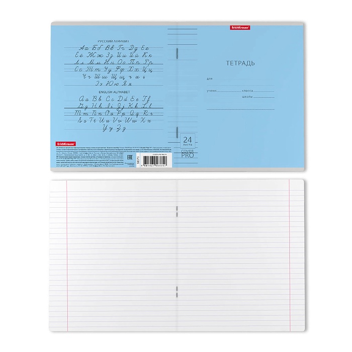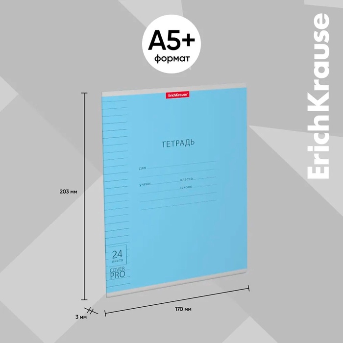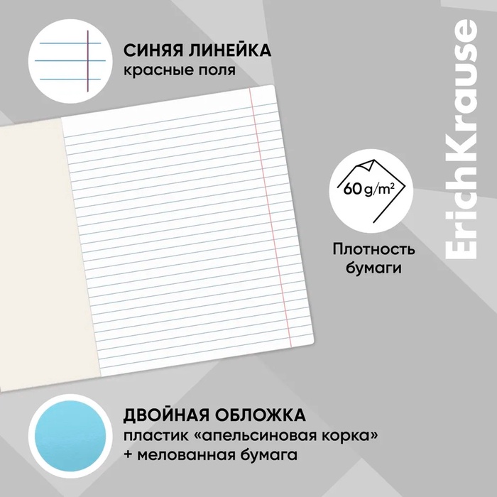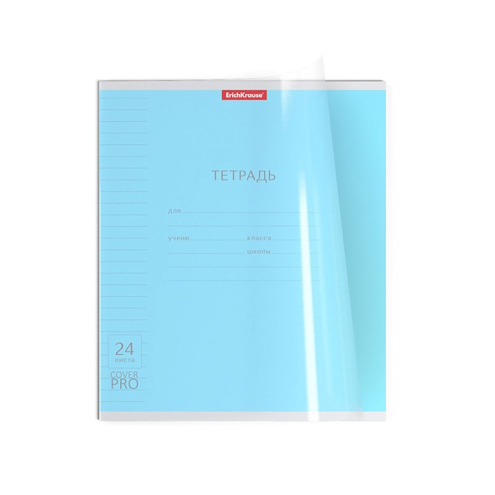 Тетрадь школьная ученическая формата А5+ (170x203 мм). Двойная обложка: внешняя выполнена из высококачественного износостойкого прозрачного пластика с фактурой «апельсиновая корка», внутренняя — из качественной мелованной бумаги. В блоке 24 листа в линейку. Бумага офсетная плотностью 60 г/м2. Цвет линовки — синий. Скругленные уголки обложки и блока. Тип скрепления — скоба. Тетради разных дизайнов упакованы в термоусадочную пленку по 10 штук.