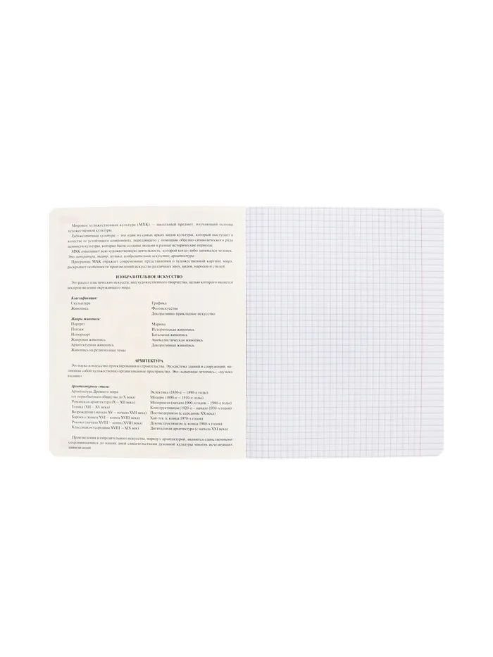 Идеально для изучения культуры: Тетрадь станет вашим надежным помощником на уроках мировой художественной культуры. Записывайте идеи, делайте зарисовки, обсуждайте великие произведения искусства и культуру разных времен и народов. Это необходимый инструмент для каждого, кто стремится углубить свои знания в области искусства.