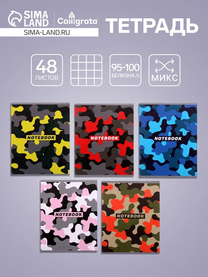 Тетрадь 48 листов в клетку Calligrata «Цветной камуфляж», обложка мелованный картон, блок офсет, МИКС — Характеристики